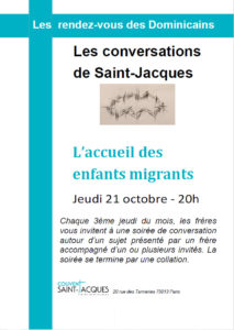 Chaque 3ème jeudi du mois, de 20h à 22h, les frères du couvent Saint-Jacques vous invitent à une soirée de conversation autour d’un sujet présenté par un frère accompagné d’un ou plusieurs invités. La soirée se termine par une petite collation. Télécharger l’affichage